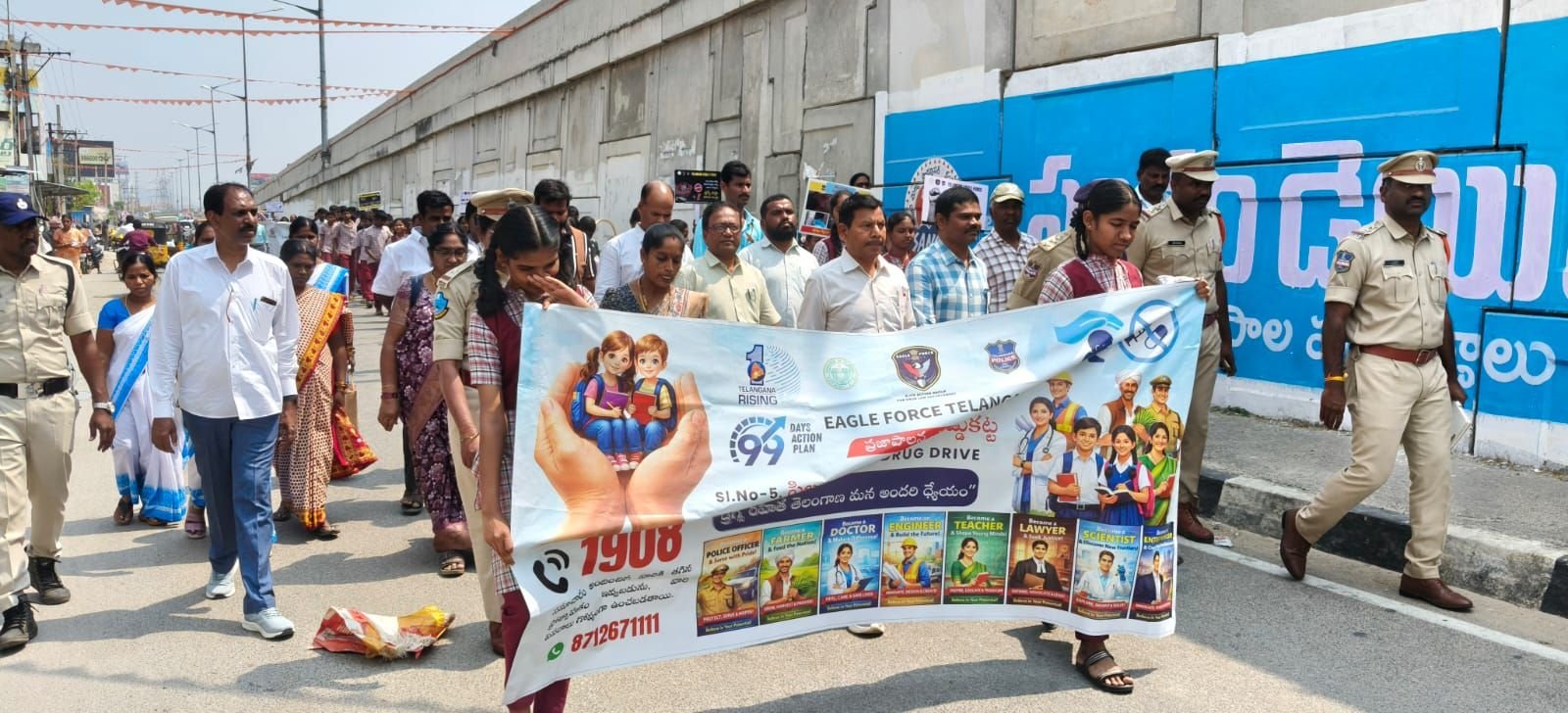 జనగామ ప్రతినిధి,(లీడ్స్ న్యూస్): ప్రతి ఒక్కరు డ్రగ్స్ కి దూరంగా ఉండాలని అప్పుడే బంగారు భవిష్యత్తు ఉంటుందని ఈగల్ ఫోర్స్ డిఎస్పి శివ నాయుడు, రఘునాథపల్లి సిఐ ఎడవెల్లి శ్రీనివాస్ రెడ్డి అన్నారు. మంగళవారం ప్రజా పాలన – ప్రగతి ప్రణాళిక కార్యక్రమంలో భాగంగా చైల్డ్ సేఫ్టీ,యాంటీ డ్రగ్ పై అవగాహన కల్పిస్తూ పోలీస్ శాఖ ఆధ్వర్యంలో రఘునాథపల్లి,ఖిలాషాపూర్, కోమళ్ళ,కంచనపల్లి తదితర గ్రామాల్లో ర్యాలీలు, అవగాహన సదస్సులు నిర్వహించారు. ఈ సందర్భంగా వారు మాట్లాడుతూ  డ్రగ్స్ కు దూరంగా ఉంటూ బంగారు భవిష్యత్తు ఏర్పాటు చేసుకోవాలని యువతకు సూచించారు. తల్లిదండ్రులు తమ పిల్లల పట్ల అప్రమత్తంగా ఉండాలని కూడా చెప్పారు. ఈ కార్యక్రమాల్లో రఘునాథపల్లి ఎస్సై దూదిమెట్ల నరేష్,పాఠశాల విద్యార్థులు, ప్రజా ప్రతినిధులు పాల్గొన్నారు.